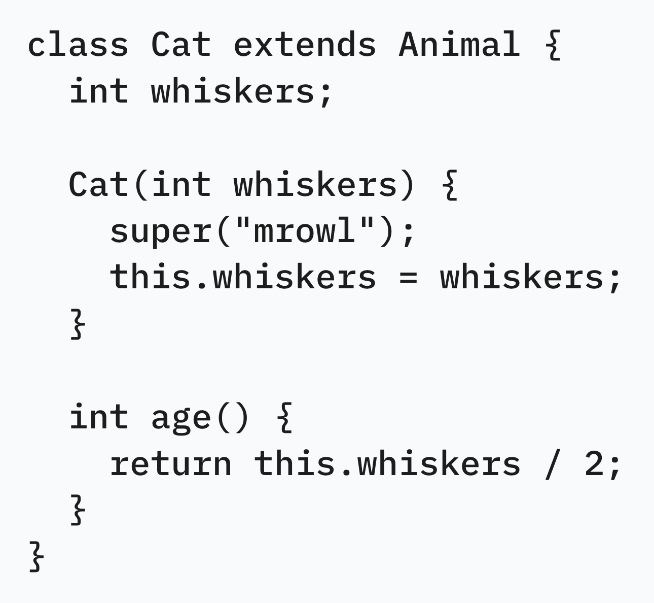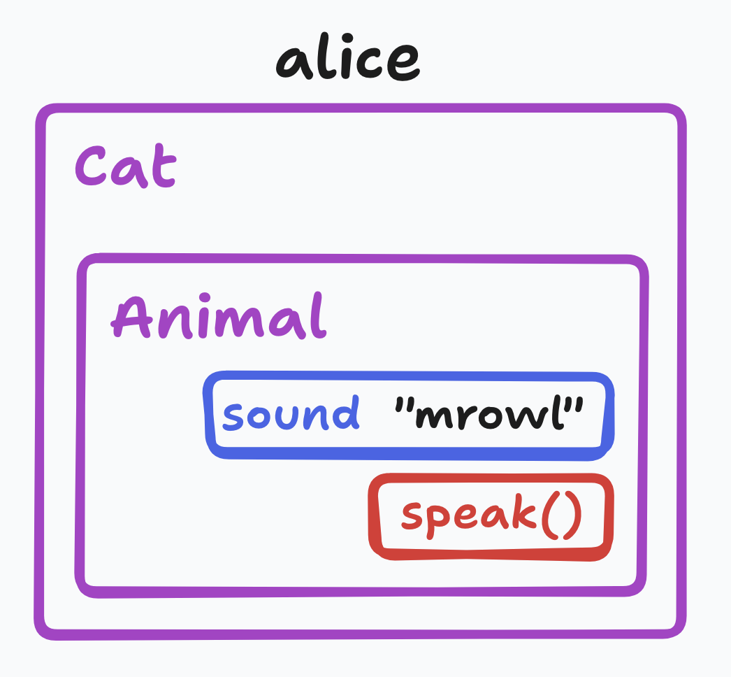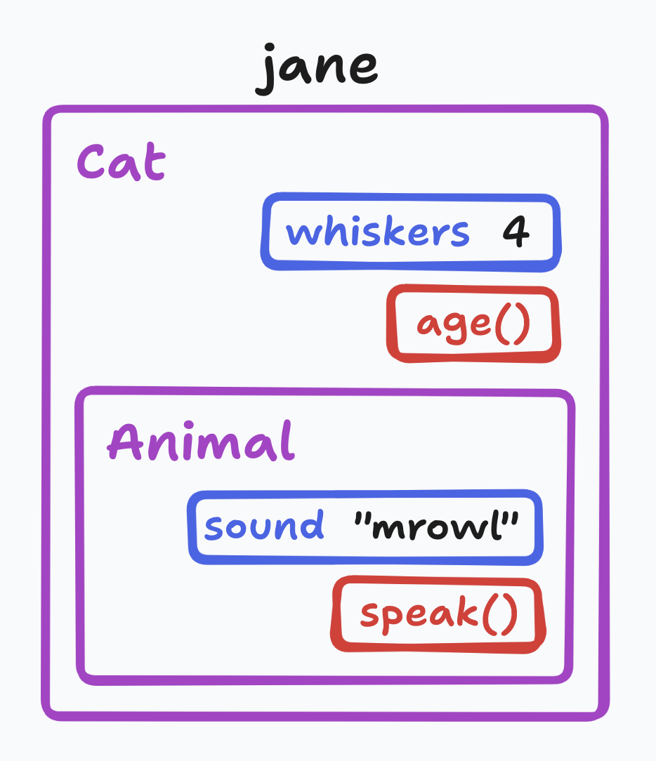 speak can be used based on the Animal superclass, and age was added for the Cat class.
